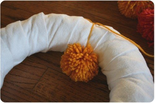 Em seguida cubra toda a base com um tecido, pode ser feltro na cor branca ou qualquer outro tecido que desejar. Agora é hora de amarrar todos os pompons até completar toda a guirlanda.